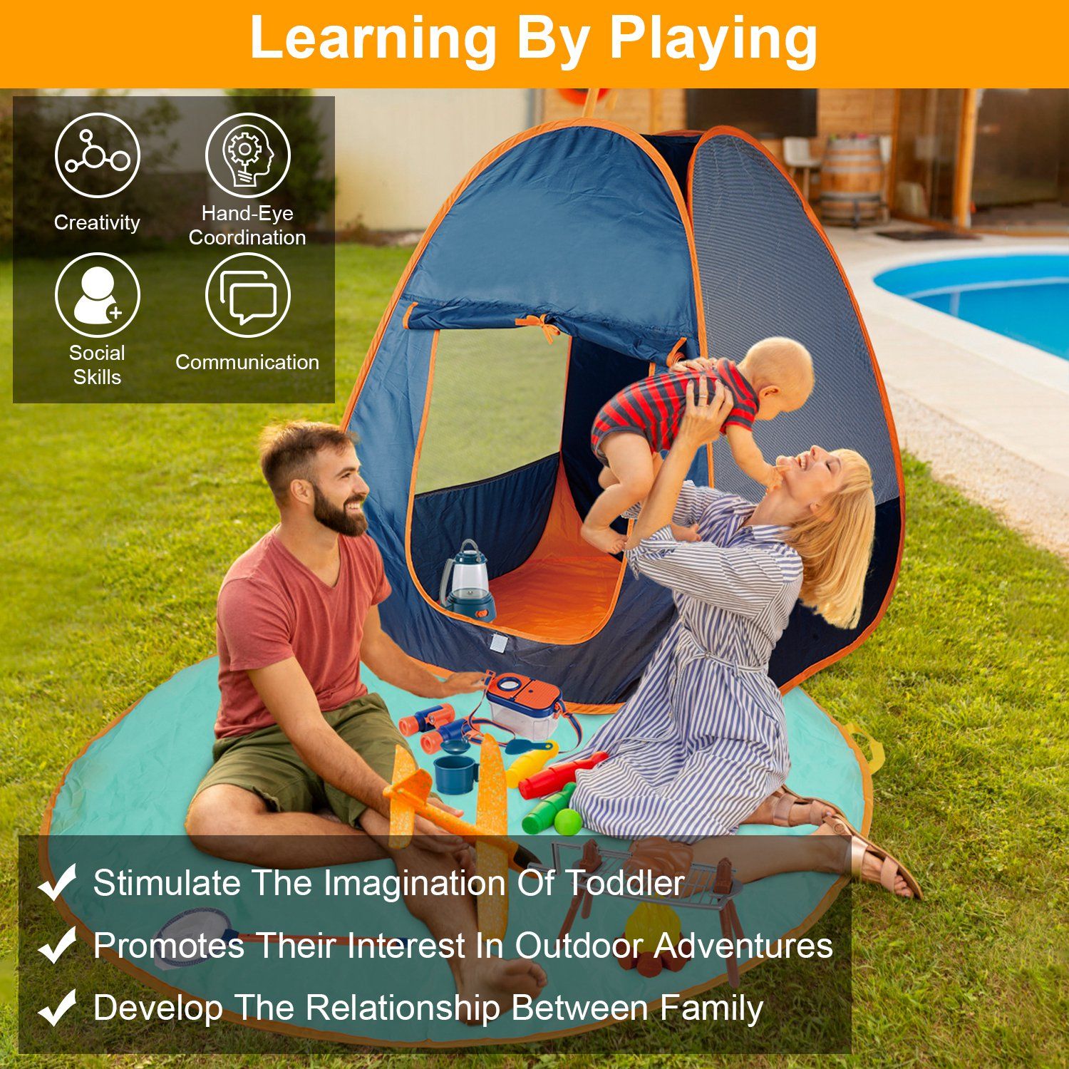 2.Our educational kids camping toy set helps stimulate the imagination of toddler, promotes their interest in outdoor adventures, which is beneficial to improve kids' ability of communication, cooperation, creativity, social skills and hand-eye coordination.