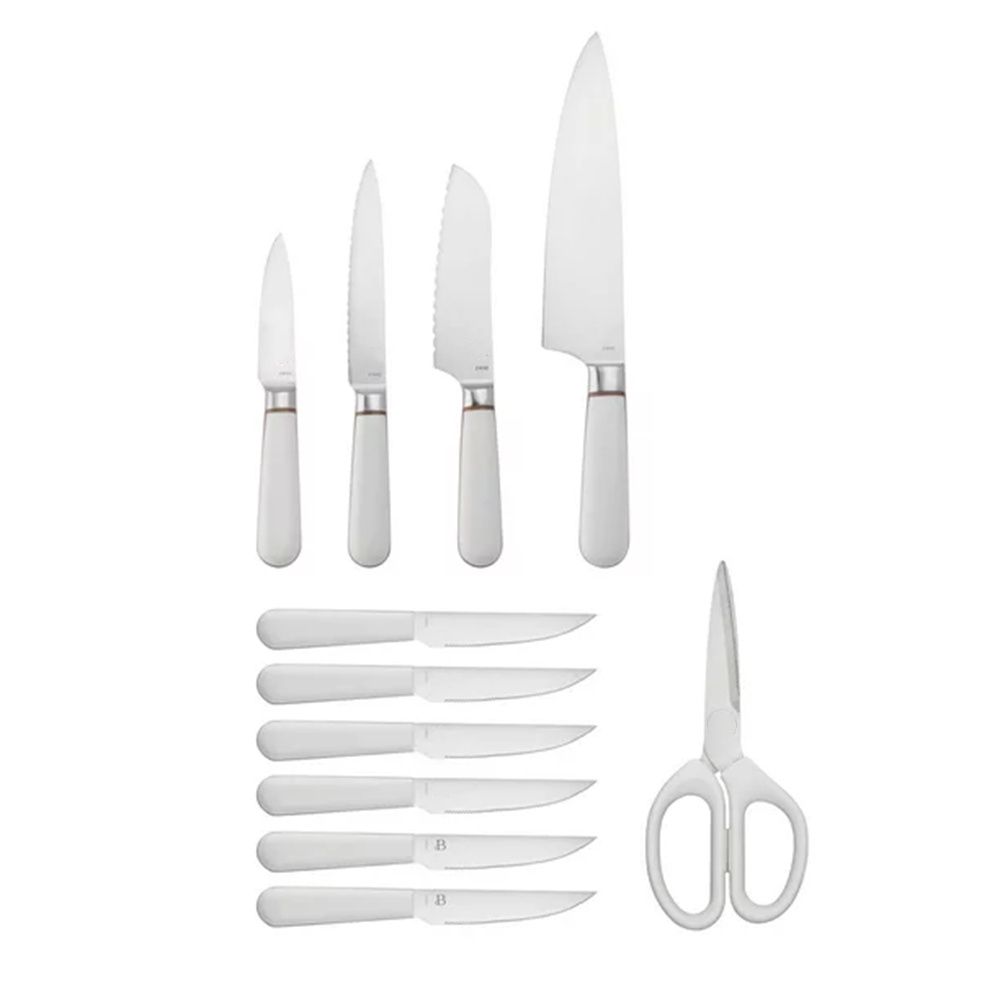 Purposeful tools create purposeful kitchen moments. The 12-Piece Knife Block Set features a variety of knives and all-purpose shears to slice; dice; mince; cut; and more. Innovative knives and shears feature white forged handles with our signature gold accents that fit comfortably in your hand. Durable 100% stainless steel long-lasting blades that maintain their sharp edges use after use; for all your cutting needs. Store and display in our signature knife block that will look beautiful on your kitchen counter. Set includes 8-inch Chef knife; 5.5-inch Serrated Utility knife; 5-inch Serrated Santoku Knife; 3.5-inch Paring Knife; six 4.5 inch Steak Knives; and All-Purpose Shears. Knives and shears are hand-wash only; wipe block clean with a damp cloth. BPA-free.