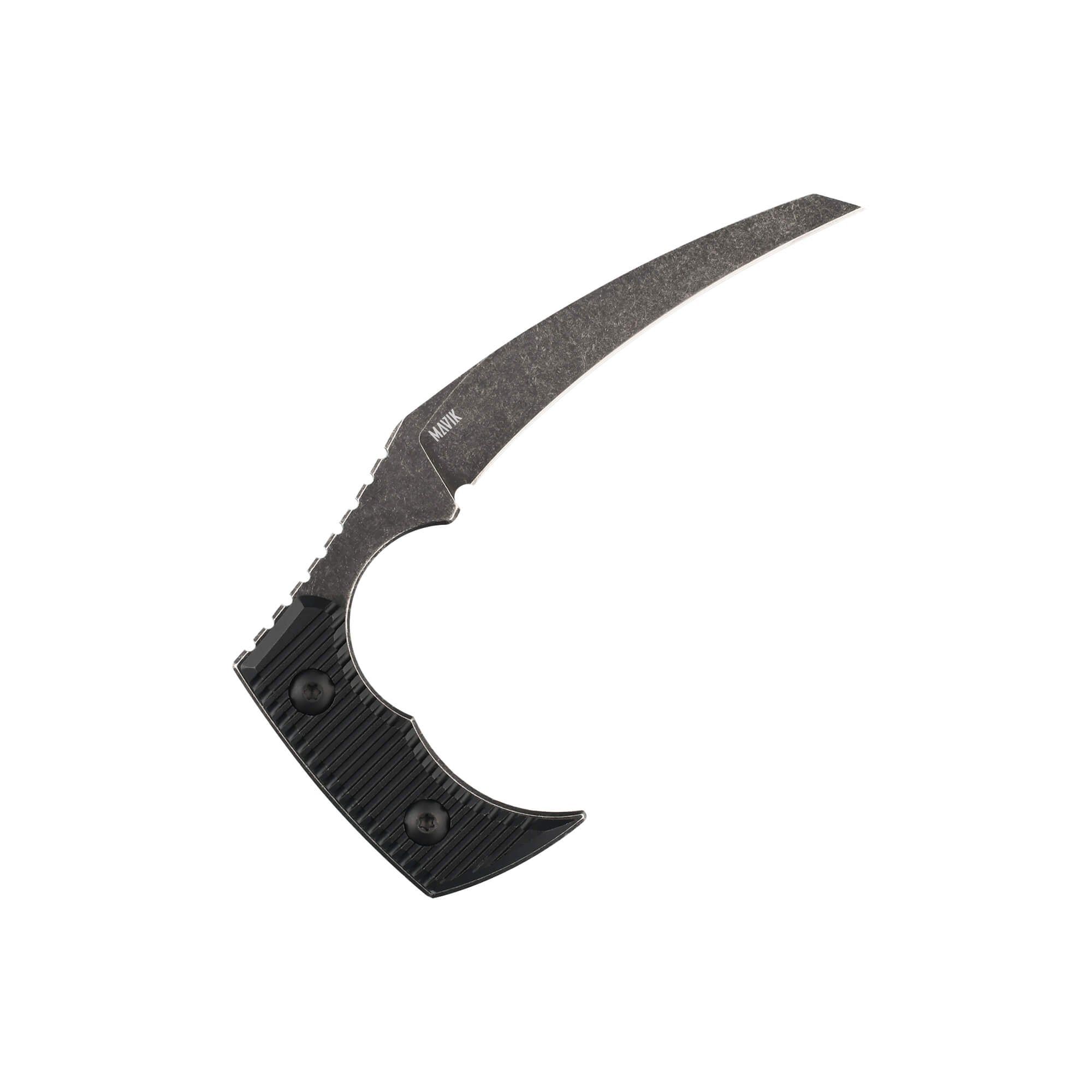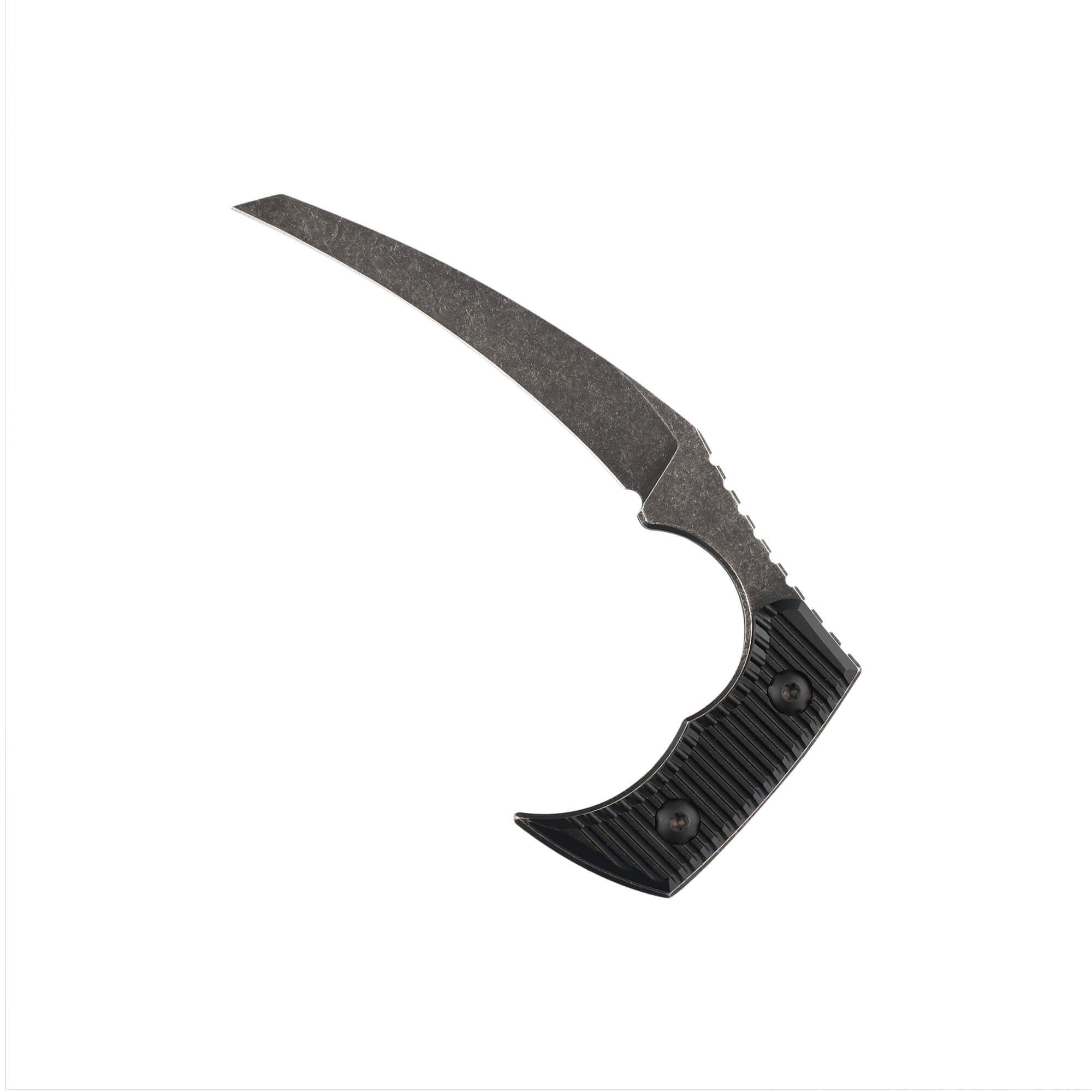 The Dagon is a powerful fixed blade knife with a unique finger grip allowing for a powerful slicing motion. Included in a leather sheath for safe transport.