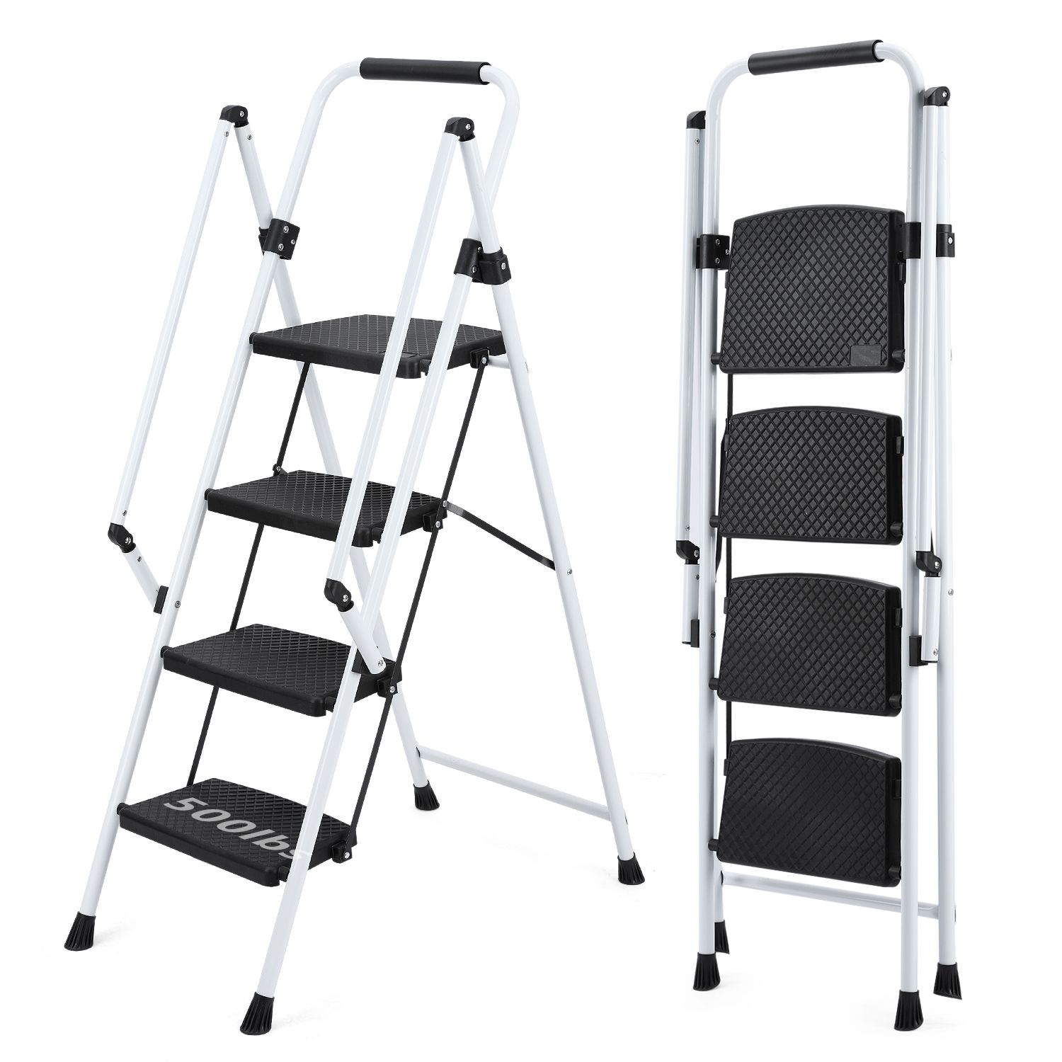 White four-step ladder, light folding four-step stool, wide anti-skid pedal and safety handle, strong steel ladder, multi-purpose ladder