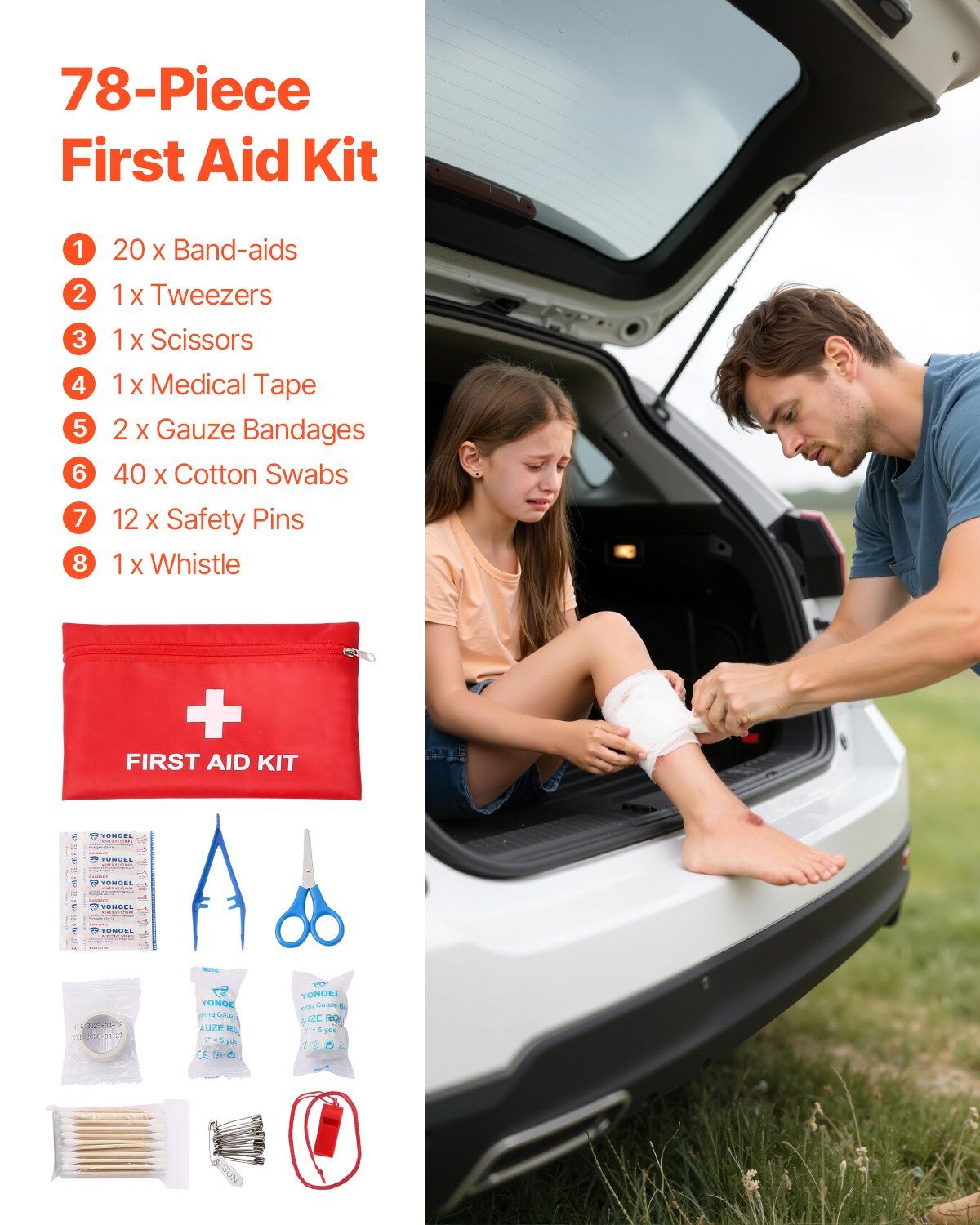 5.Compact First Aid Supplies: The roadside emergency kit includes everyday medical essentials like bandages, tweezers, scissors, medical tape, gauze rolls, cotton swabs, pins, and a whistle-ready to treat minor injuries anytime