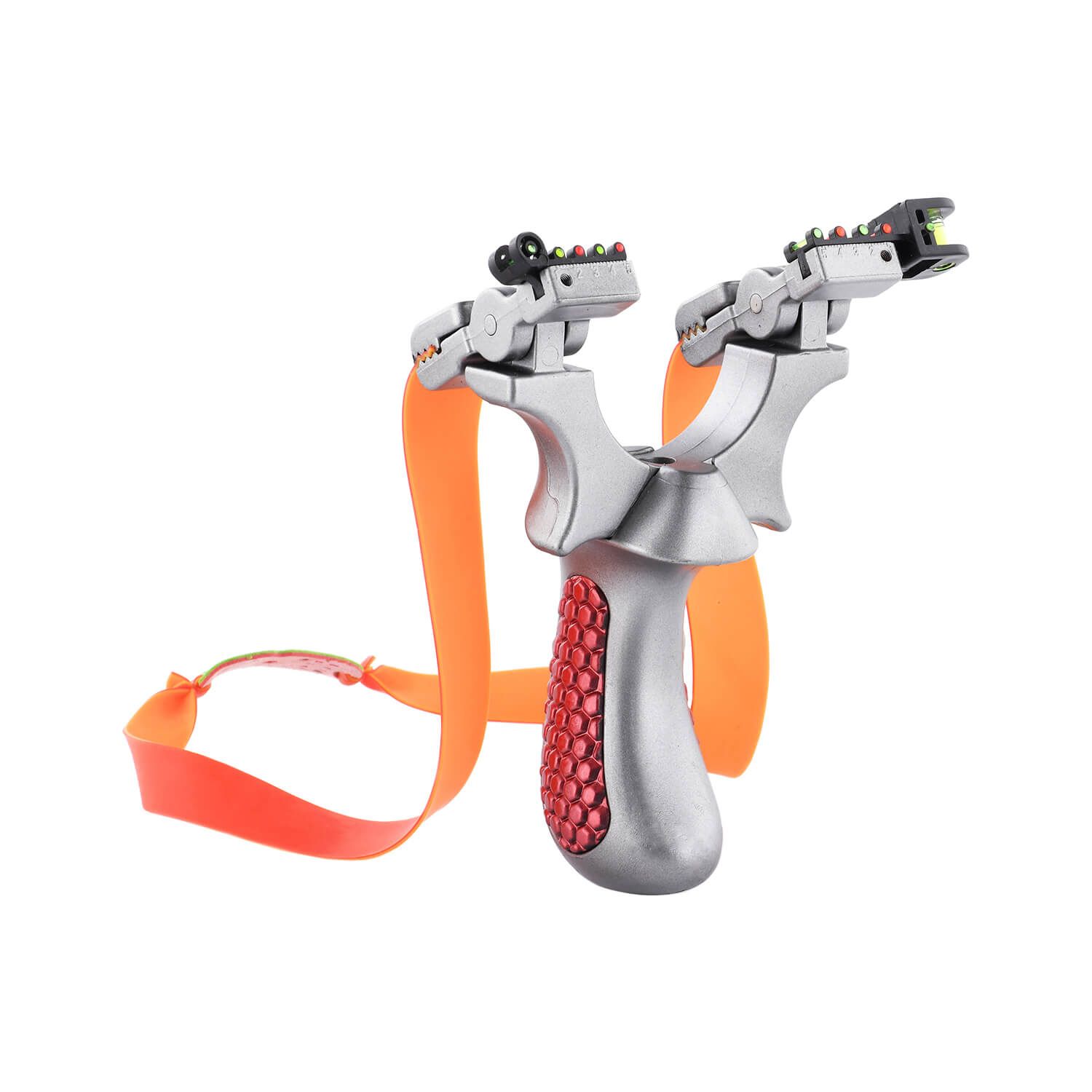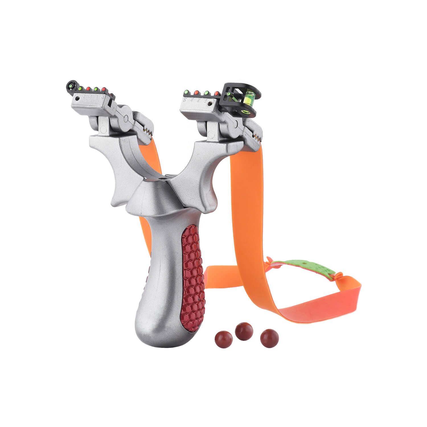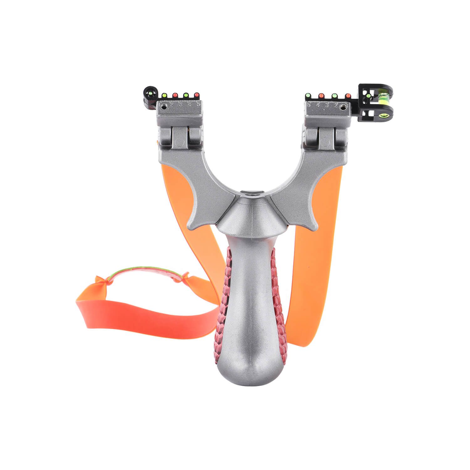 The Ballista 14 - flashy, bold, tough. The tactical slingshot comes with two high-tension rubber bands, comfortable red grips, and a gradienter to assist with precision aiming.