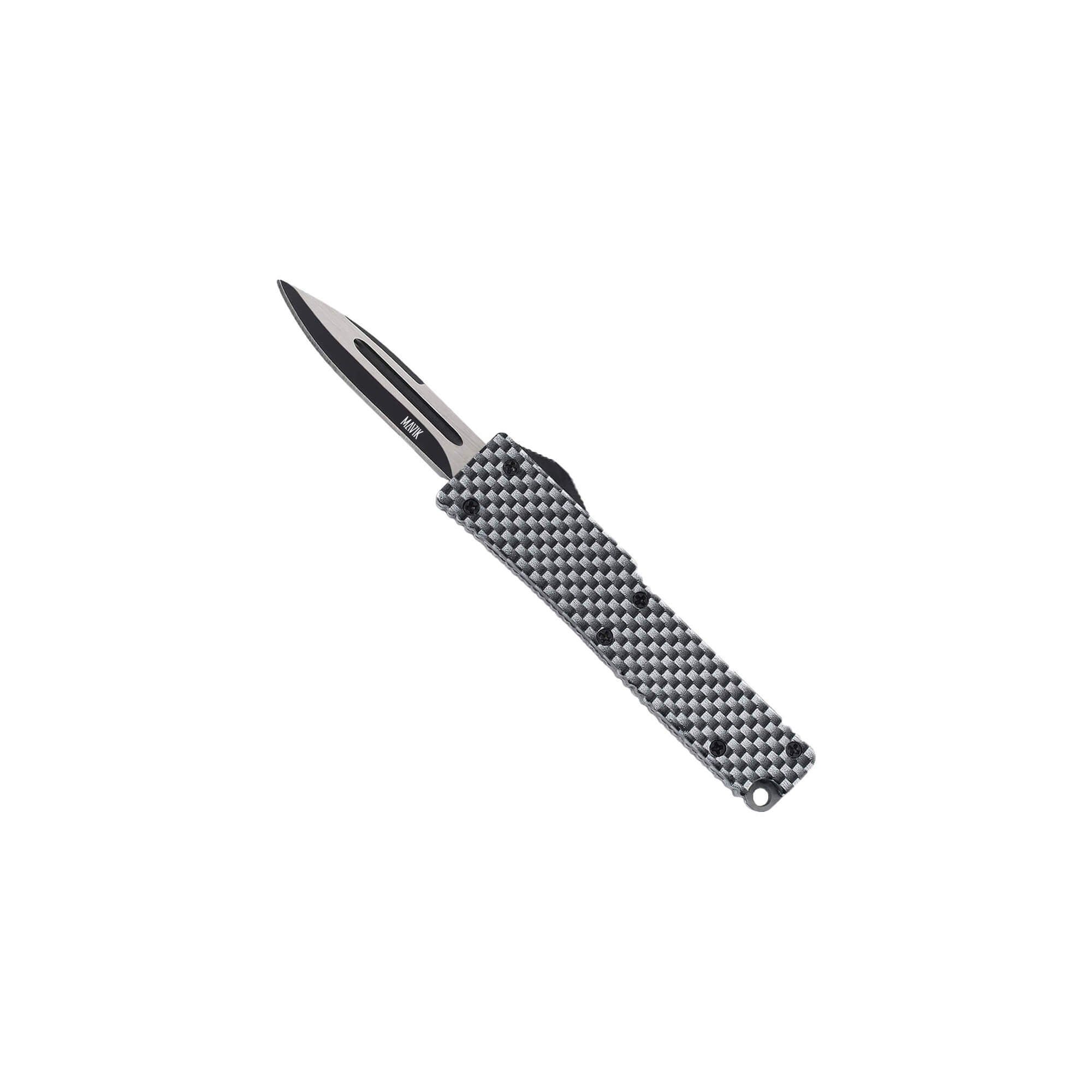 The Sly is a powerful dual-action mini automatic OTF knife. It comes with a pocket clip and a built in loop for a lanyard in the handle. This model has a drop point blade.